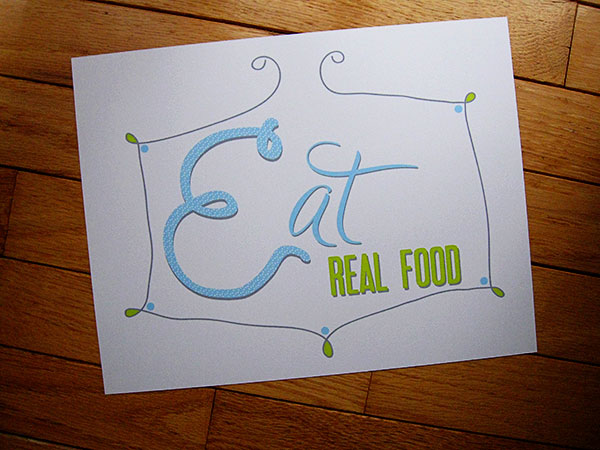 Last week, I introduced the E in my year-long series of hand-drawn letter creations. Below is the print I designed for the letter. It’s a shout out to the month-long call to Eat Real Food on Not Dabbling in Normal.