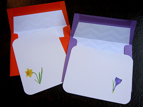 The first designs for spring stationery. I have four more flowers to draw and color, but I’m excited with these bright and fresh cards. I’m digging the chevron stripes for the envelope liners too.