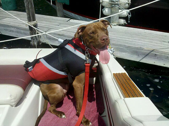 He has a life jacket which he loves to wear for his boat rides!
