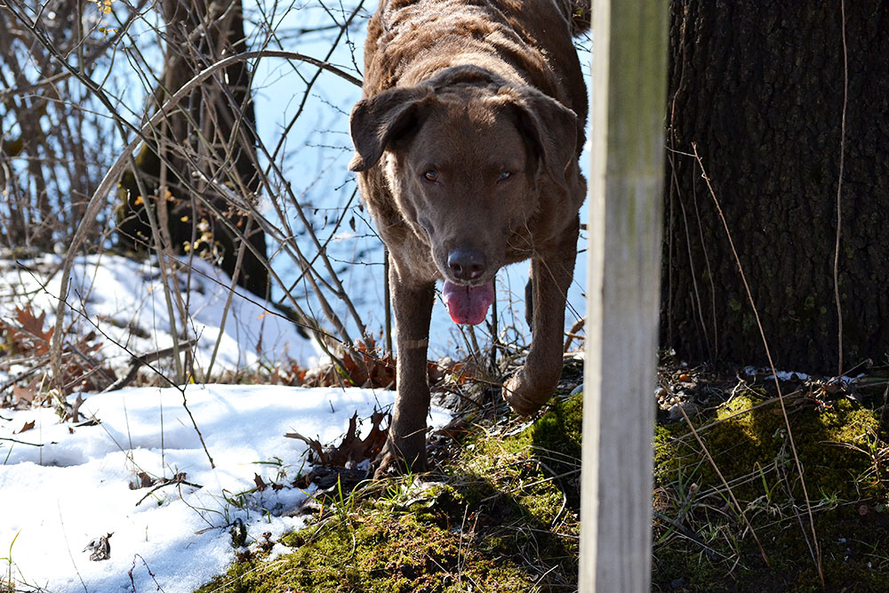 It’s rare on a walk with Scout to snap a photo of her whole face. As you would think, it’s mostly nose to the ground, tail in the air and the quick “check-in” glance to make sure I’m still in radar distance. The opportunity for this photo of her full-on face materialized because she had to check out a dead bird downhill by the water. I caught her with the telephoto on her satisfied return. Head-on.